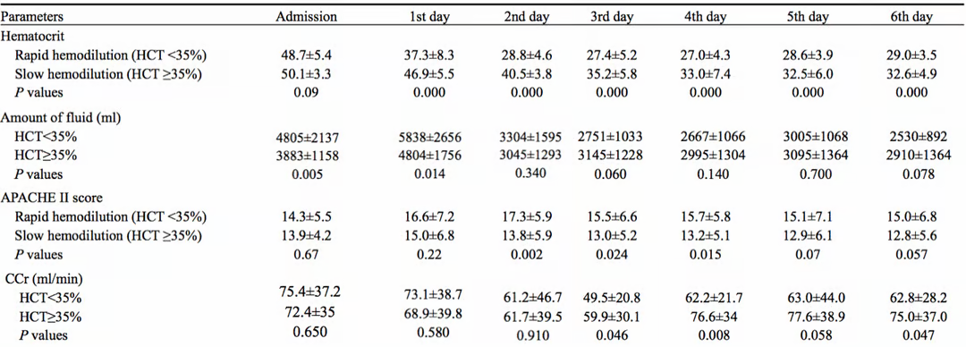 Độ cô đặc máu tương quan với kết cục xấu, và do đó, người ta đã đề xuất rằng bồi phụ đủ dịch để đảo ngược cô đặc máu có thể cải thiện kết cục. Mao (2010) phân bổ ngẫu nhiên 115 bệnh nhân viêm tụy cấp nặng vào 2 nhóm, nhóm hòa loãng nhanh (mục tiêu hematocrit <35% trong 48 giờ) và nhóm hòa loãng chậm (mục tiêu hematocrit >35% trong 48 giờ). Những bệnh nhân ở nhóm hòa loãng nhanh nhận nhiều dịch hơn lúc nhập viện và trong ngày nằm viện đầu tiên (bảng dưới). Nhóm hòa loãng nhanh có tỷ lệ nhiễm trùng huyết cao hơn đáng kể (79% với 58%), điểm APACHE II cao hơn, độ thanh thải creatinine thấp hơn và tăng tỷ lệ tử vong (34% với 15%). Như vậy, chiến lược hồi sức dịch tích cực sớm một lần nữa được chứng minh là làm xấu kết cục.